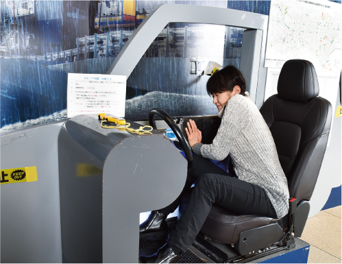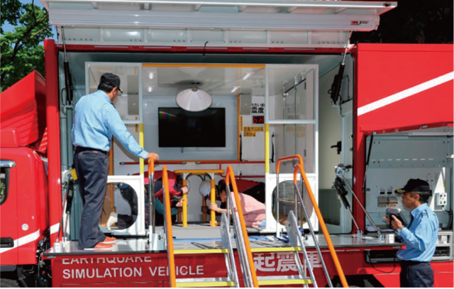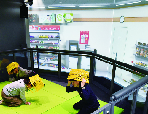 地震体験コーナーは、室内だけでなく、屋 外やコンビニエンスストア店内での地震体 験ができるほか、ガラススクリーンを通して 待っている方に地震時の大切なポイントを伝 えます。
