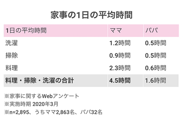 コズレ子育てマーケティング研究所の2020年の調査では、ママはパパの2.8倍の時間を家事に費やしていることがわかりました。