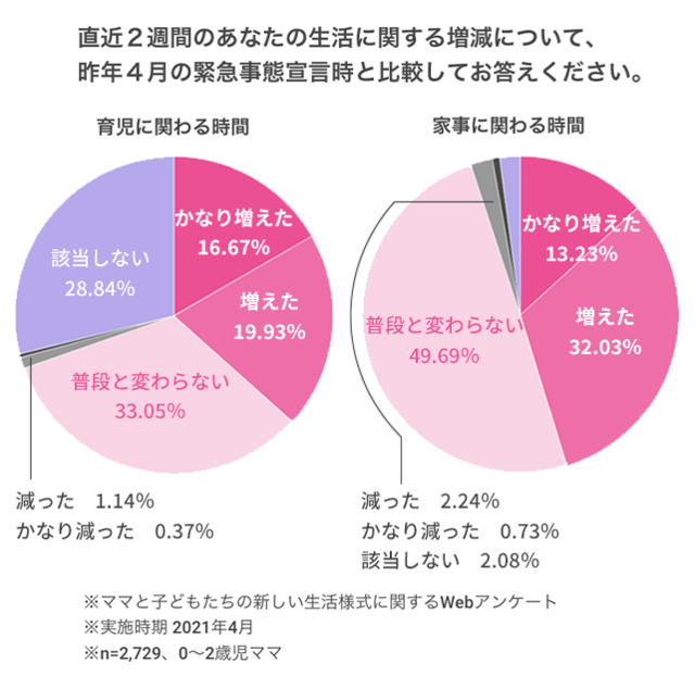 家事にかかわる時間は「かなり増えた」「増えた」と感じたママは約45%でした。
