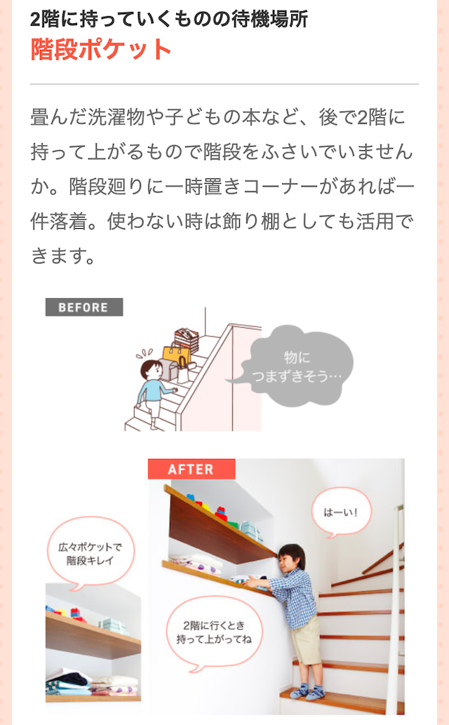 出典:www.daiwahouse.co.jp散らかりやすい園や学校からのプリントを壁にまとめておくスペース「お便り紙蔵庫」や、階段付近に2階に上がる時に持って上がるものを置いておく「階段ポケット」など。