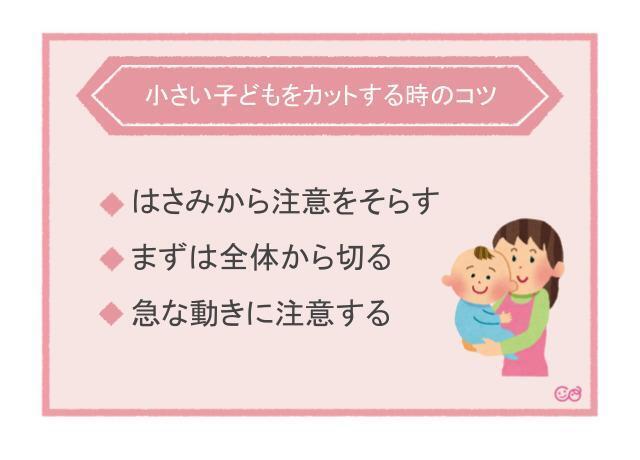 前髪から切ると、子どもが驚いたりカットを嫌がったりする場合があるので、はさみが子どもの視界に入らないところから切り始めましょう。