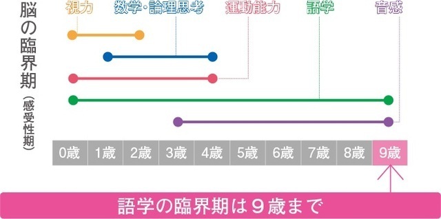 出典:www.winbe.jp脳の吸収力がとても高い時期を指す「臨界期」という言葉がありますが、言語の習得で言えばその「臨界期」は9歳までと言われています!