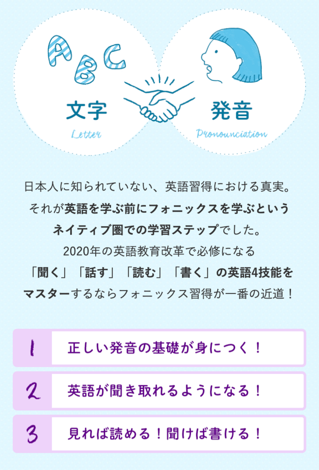 正しい発音と文字のルールを習得し、英語教育改革でも重視されている「聞く」「話す」「読む」「書く」の4技能の力を伸ばすことにつなげていきます。