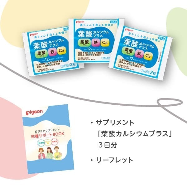 「葉酸カルシウムプラス」3日分に加えて、妊娠期~授乳期にかけてのからだのケアについて教えてくれる「栄養サポートBOOK」をプレゼント♪