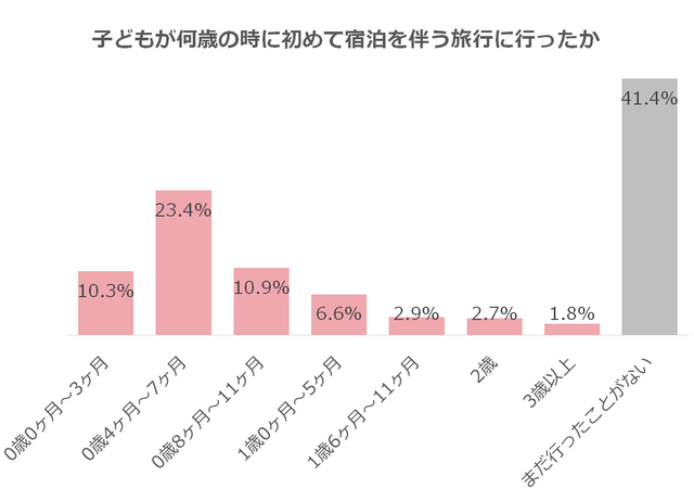 まだ行ったことがないという方も4割程度いますが、子連れ旅行をしたママパパの内訳をみると1歳未満で旅行をしている方が多いようです。