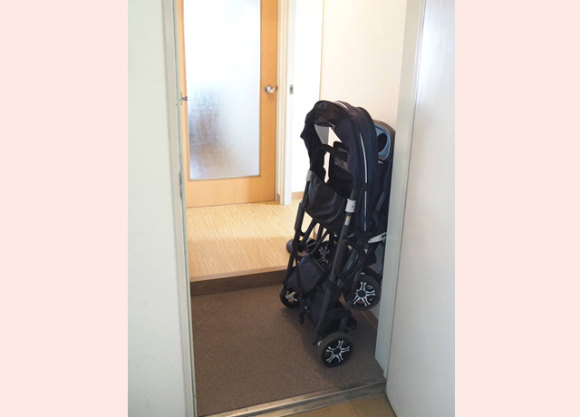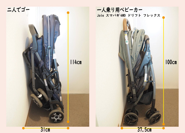 そこで、一人乗り用のベビーカー「Joie スマバギ4WD ドリフト フレックス」と玄関に畳んで置き比べてみると…。