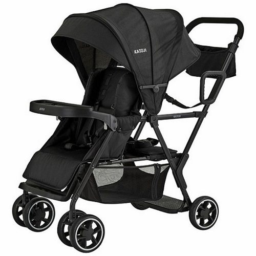 「二人でゴー」は、二人が前と後ろに乗る作りになっている縦型のベビーカー。前は年齢の小さい子が、後ろは年齢の大きい子が座れるようになっています。
