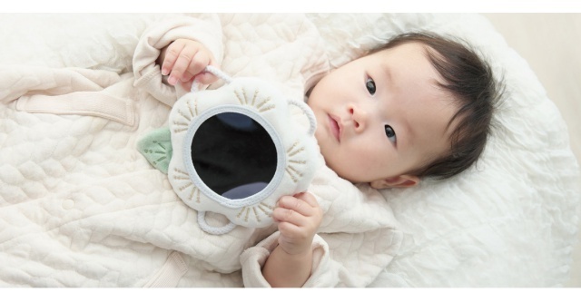 「わっかミラー」は、好奇心旺盛な赤ちゃんのためにつくられた布製のソフトミラーです。身の回りのものに興味が出てくる生後6か月頃から、視力の発達とともにミラーに映るものを目で追いかけたり、観察するようになります。ミラーに映るものを見ることは、赤ちゃんの想像力を育み、自己への認識のきっかけを作ります。赤ちゃんが自分で掴んでミラーを覗き込めるように、周囲には柔らかい紐のわっか(輪)を取り付けました。