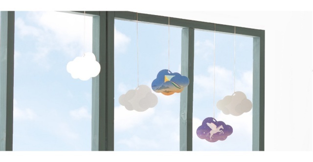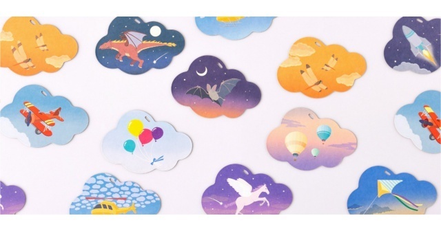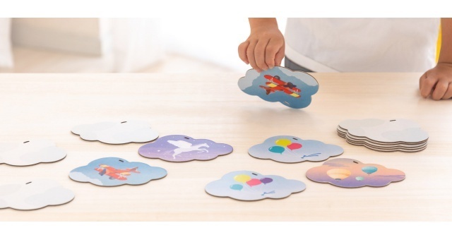 雲のかたちをした大きなカードをめくって、同じモチーフをペアにしていく2歳から遊べるカードゲームです。空から連想するものが描かれたカードは、ペア同士で少しだけ絵柄が異なっているため、親子で絵を見ながらお話を作ったり、間違い探しをしたり、ゲームができなくても低年齢から楽しめます。