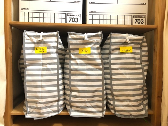 はなみずきさん お下がりのお洋服類は、サイズやアイテム別に100均のファスナー付きショッピングバッグに分けて。最近依頼者様に良くお勧めしているのはダイソーのマルチバッグです