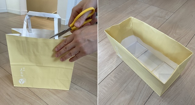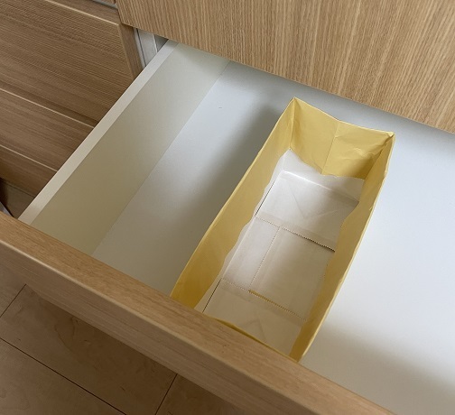 seaさんのおすすめは、上の図のようにおうちにある固めの紙袋の持ち手を切り、上部を折り込んで区切りケースにする方法です。