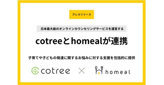 この連携によって、「cotree」をご利用中のみなさまは、累計42万食以上を販売している幼児食宅配サービス「homeal」のはじめてセットを特別割引価格でご利用いただけます。また、「homeal」をご利用中のみなさまは、24時間いつでもどこでも安心して厳正な審査を通過した220名以上の専門家が在籍している「cotree」のオンラインカウンセリングを特別割引価格でご利用いただけます。