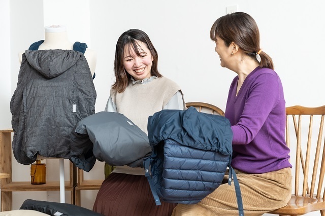 様々な検討ポイントが出てきたところで、実際の防寒ケープをももこさんと先輩ママたちで細かくチェック。