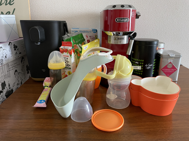 ①哺乳瓶やマグのパーツ、離乳食グッズなど赤ちゃんアイテムが散らかってしまう。