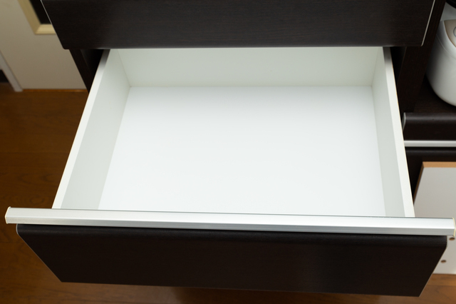 浅めの引き出しには、小さな食器やマグ、カトラリーを入れるのがおすすめ。
