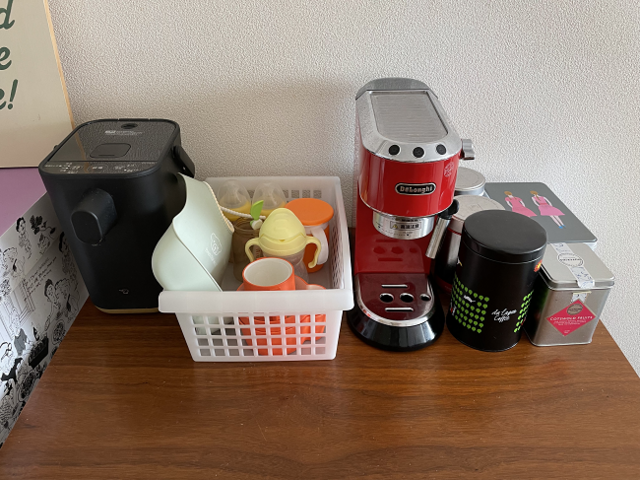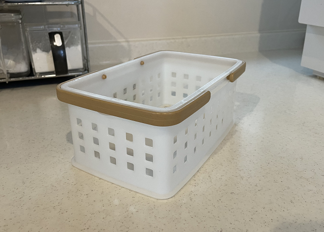 引き出しの数が少なく、シリコンのスタイも哺乳瓶もマグも出番が多いため、まとめてカゴに入れて作業台の上に置くことに。