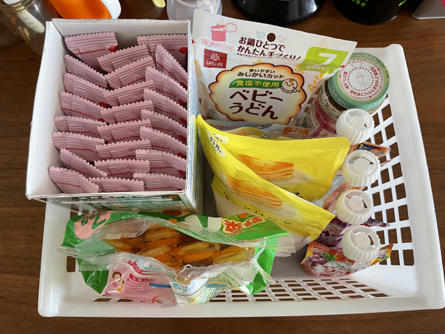 ミルクのスティックやベビーフードの食材も、よく使うものを選び出し、別のカゴにまとめて収納。