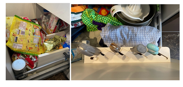 一番下の引き出しに入っていたお菓子を移動し、包丁や調味料をひとつの収納にまとめて、ベビーガードをすべての引き出しにつけました。