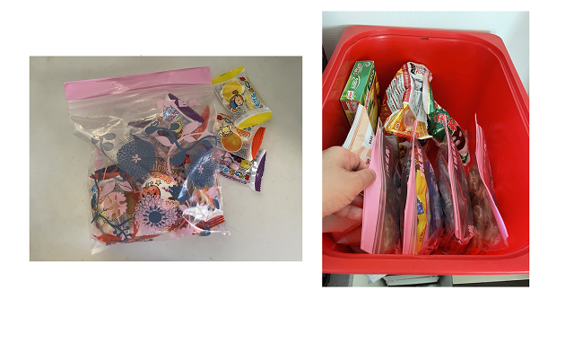 また、あめやチョコレート、ラムネなど細かいお菓子はケースの中で埋もれてしまうので、ジッパー付きの袋にまとめて入れ、ほかのお菓子と大きさを合わせます。
