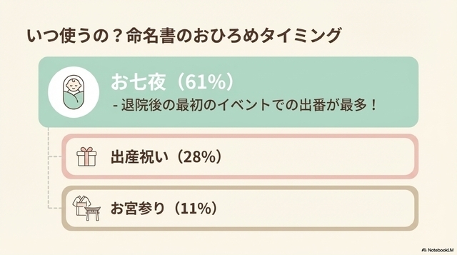 コズレが行った「命名紙・命名書」に関するアンケートによると、「命名式・お七夜」以外にも「出産祝い」や「お宮参り」「ニューボーンフォトの撮影時」「100日祝い・お食い初め」の機会でも利用されている方もいるようです。