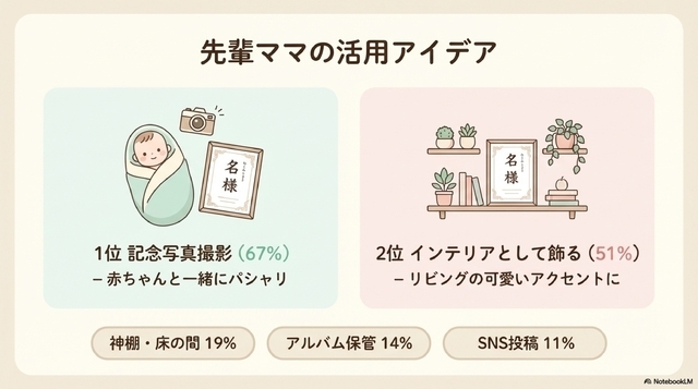 命名紙・命名書を利用されたことのある先輩ママパパへのアンケートによると、「命名式・お七夜」はもちろん、「出産祝い」「お宮参り」「100日祝い・お食い初め」などの、お祝いの場での記念写真撮影に活用されている方が多数いらっしゃることが分かりました。