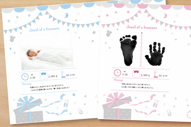 出生記録以外にも、手形足形、赤ちゃんの写真、妊娠中のエコー写真を貼るなど、アレンジは自由自在です。