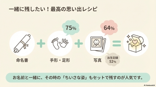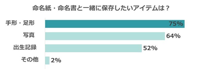 アンケート結果によると、命名紙・命名書と一緒に赤ちゃんの手形足形、写真、出生記録などを一緒に保存しておきたいという方が多いです。