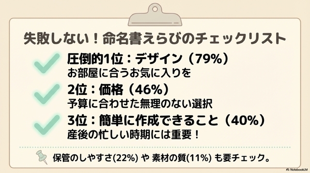 「命名紙・命名書」を利用されたことのある先輩ママパパへのアンケートによると、「命名紙・命名書」はデザインの良さ、価格、作成のしやすさを重視して選ばれていることが分かりました。
