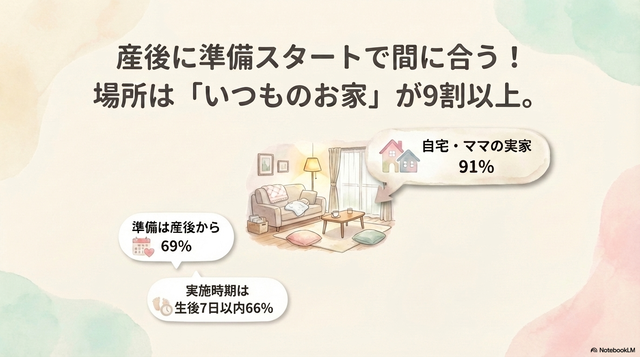 やはり出産直後のお祝いなので、ママや赤ちゃんがリラックスして過ごせる「自宅」や「ママの実家」が一般的なようです。里帰り出産をするかどうかによって、行う場所も変わりますね。
