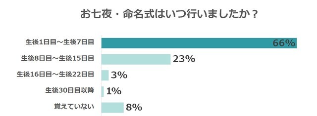 「お七夜・命名式」は約7割のママパパが「生後1日目~生後7日目」までに行っており、次いで約2割のママパパが「生後8日目~15日目」に行っています。
