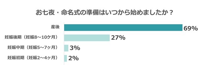 また準備期間は、「産後に準備を始めた」ママパパが7割、全体として妊娠後期~産後にかけて準備するのが一般的なようです。