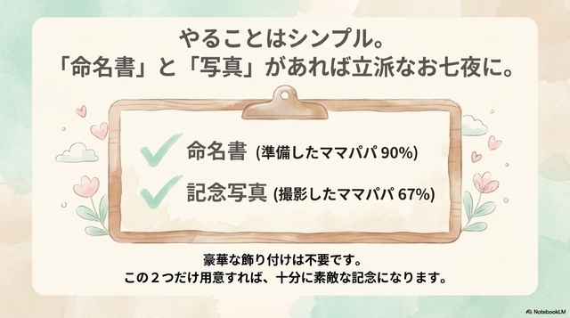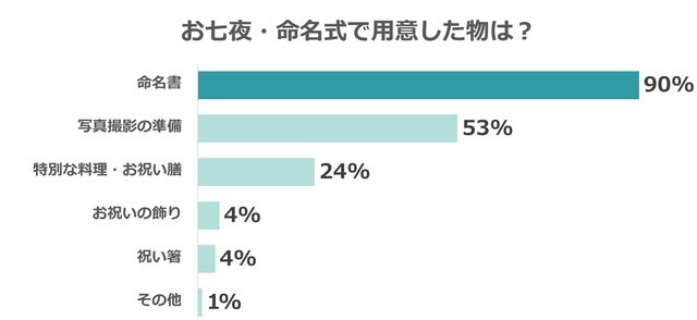 アンケート結果を見ると、「命名書」「写真撮影の準備」「お祝い膳」など、「お七夜・命名式」で行う内容に沿ったアイテムの準備も必要になりますね。