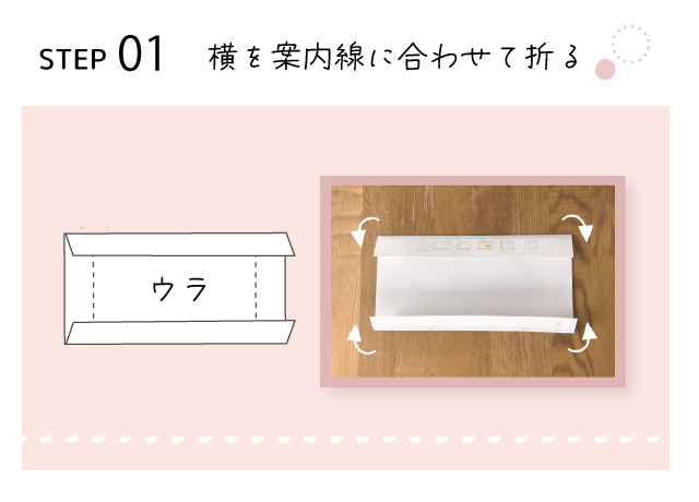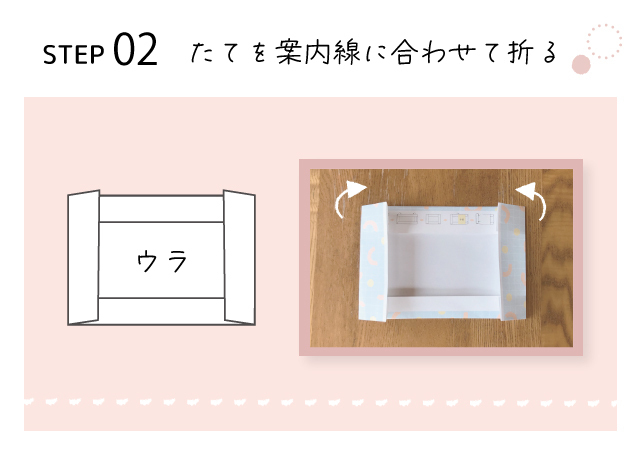 ②母子手帳に合わせて、印刷した用紙を上下左右の折り線で軽く折る。
