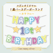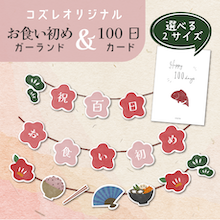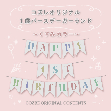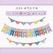 | 特徴 | 赤ちゃんの誕生記念用ガーランド。カラフルなフラッグ(旗)のデザイン。 | 生後1ヶ月のお祝いに使えるガーランド。優しい色味のグリーンとイエローの2色展開。 | お食い初めにちなんだ縁起の良いデザインのガーランドと100日月齢カード。 | お食い初めや100日記念に使える100daysガーランド。ポップなデザインで華やかに。 | 生後6ヶ月記念に使えるハーフバースデーガーランド。ブルーとピンクの2種類。 | 1歳バースデーガーランド。パッと華やぐカラフルデザイン。 | 1歳バースデーガーランド。くすみカラーのシックなデザイン。 |