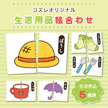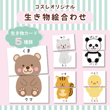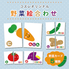 | 特徴 | 野菜の絵合わせカード5種類。ひらがな表記がついているので、絵合わせと文字合わせゲームができます。 | 生活アイテムの絵合わせカード5種類。いつもよく使うものばかりなので子どもも覚えやすいです。 | 生き物の絵合わせカード5種類。頭と体を組み合わせるデザインで、絵合わせ初心者の子どもにもおすすめ。 | 乗り物の絵合わせカード5種類。ひらがな&英語表記もあるので英単語の勉強にも。 | フルーツの絵合わせカード5種類。イラストの好きな箇所をカットして、パズルのように遊べます。 |