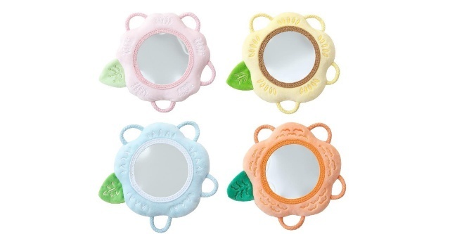 ミラーに映るものを見ることは、赤ちゃんの想像力を育み、自己への認識のきっかけを作ります。赤ちゃんが自分で掴んでミラーを覗き込めるように、周囲には柔らかい紐のわっか(輪)を取り付けました。