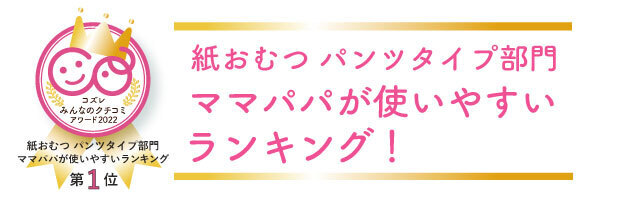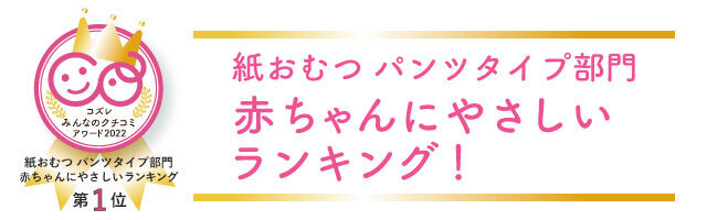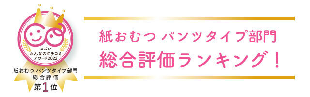 この度は、「紙おむつパンツタイプ部門 総合評価ランキング」で第一位に選出いただき、ありがとうございます。みなさまに高い評価をいただき、大変嬉しく思っております。