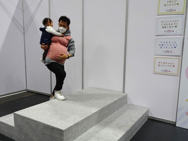 「妊婦さんってこんなに大変なんだ」大人気!パパやプレママさんの妊婦体験コーナー、カップルやご夫婦で是非ご参加ください。