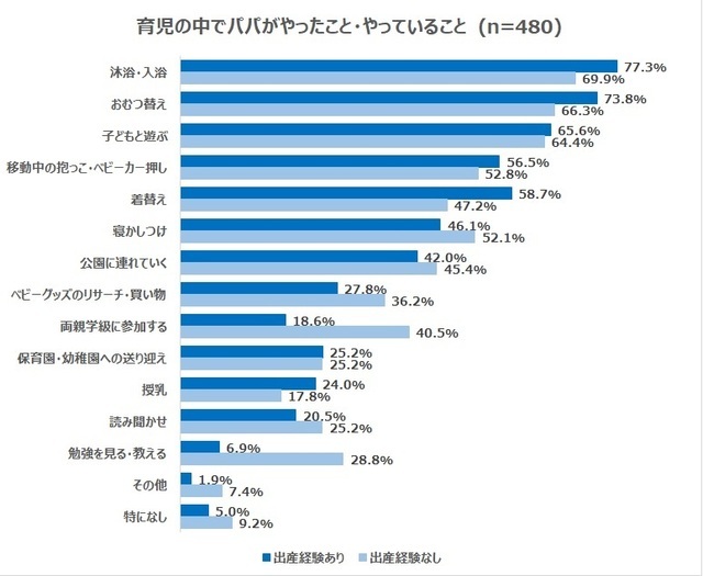 育児経験ありのパパとなしのパパの比較をしてみると、育児経験ありのパパの方が沐浴・入浴、おむつ替え、着替えの育児をやっているということがわかりました。