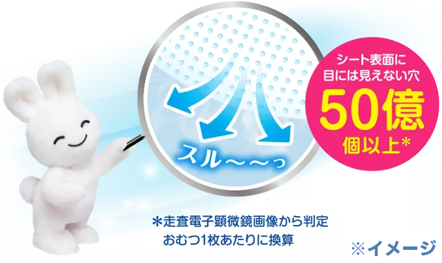 出典:www.kao.co.jp目には見えない穴が50億個以上*¹の全面パワフル通気シートがおむつの外側に湿気を追い出し、ずっと肌はさらさらなんです。