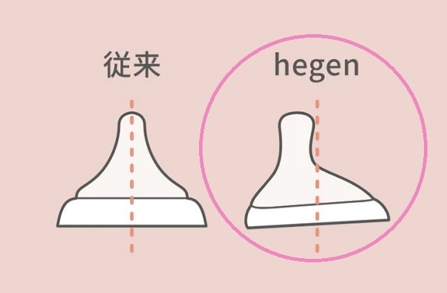 Hegen(ヘーゲン)独自の乳首のデザイン「センターオフニップル」(上図右)は一般的な哺乳びん(上図左)に比べ、中心から少しずれています。