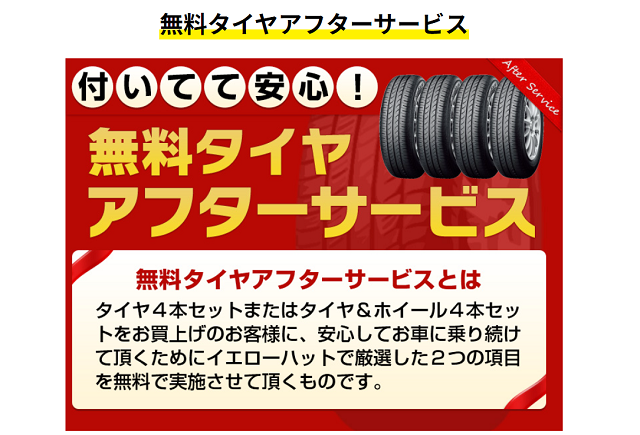 出典:www.yellowhat.jpタイヤ4本セット、またはタイヤ&ホイール4本セットを購入した方※1には、無料で2つのアフターサービス付き!
