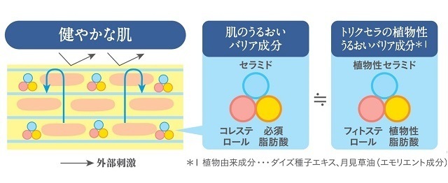 アベンヌ トリクセラNT フルイドクリームはこの成分と似た働きを持つ、3つの植物性うるおいバリア成分*(植物性セラミド・植物性脂肪酸・フィトステロール※写真上右)を配合、お肌のうるおいバリアを補います。さらに、角層のすみずみまでうるおいを届けて長い時間うるおいをキープ♪