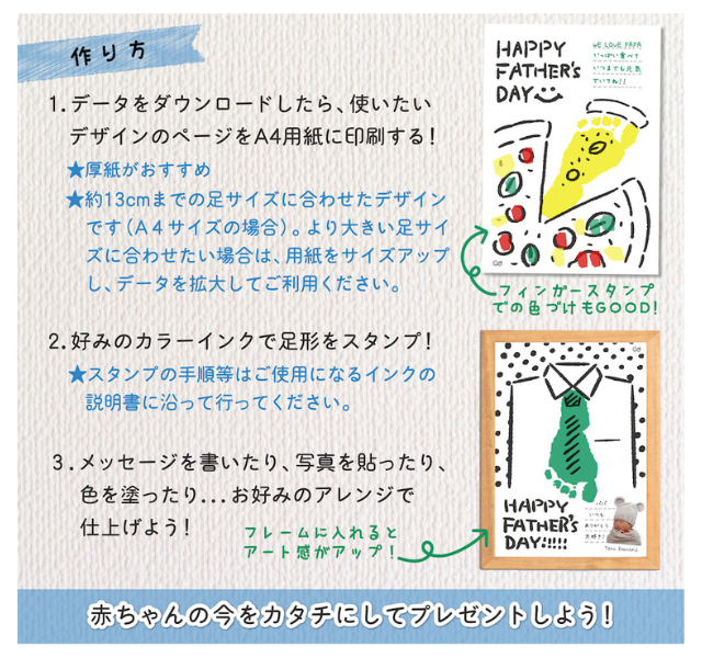 出典:feature.cozre.jp子どもの足形でかわいいアート作品が作れる台紙です。デザインは3種類あるので、パパの雰囲気や好みに合わせて選んでくださいね。