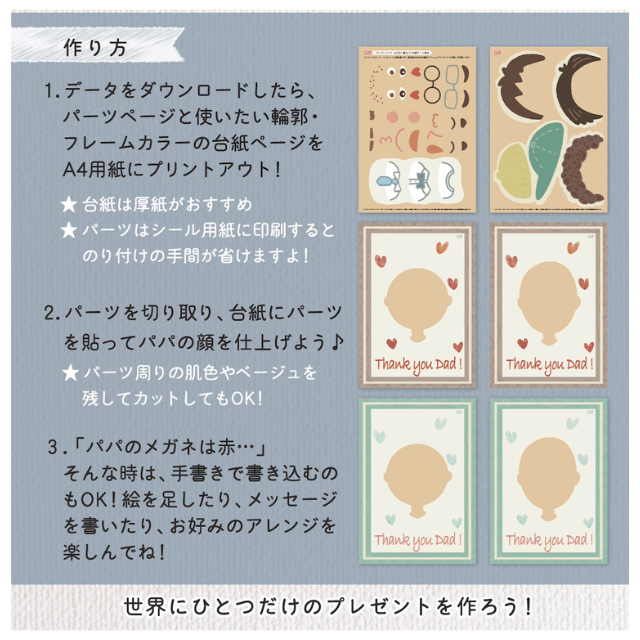 | 特徴 | お子さんの足のスタンプで父の日のプレゼントにぴったりなアート作品が作れます。 | 顔の台紙とパーツがセットになっているので、パパの似顔絵が簡単に作れます。 | お子さんの写真を、父の日用デザインテンプレートに合成して、特別な成長記録フォトが作れます。 | お子さんの写真と言葉や名前を添えて送れる、父の日限定のメッセージカード。ブルーとグリーンの2色。 |