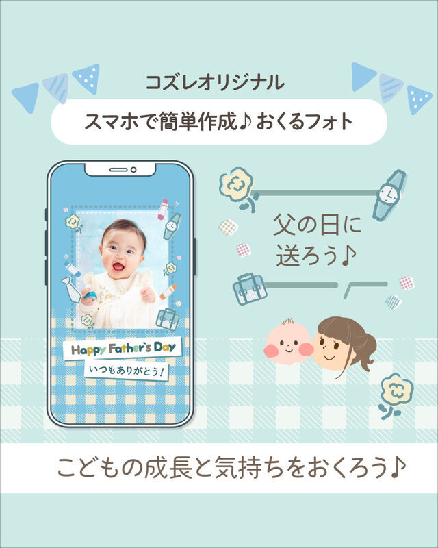 出典:feature.cozre.jpこちらは、スマホに保存してあるお子さんの写真を、父の日用デザインテンプレートに合成して、特別な成長記録フォトが作成できるコンテンツです。