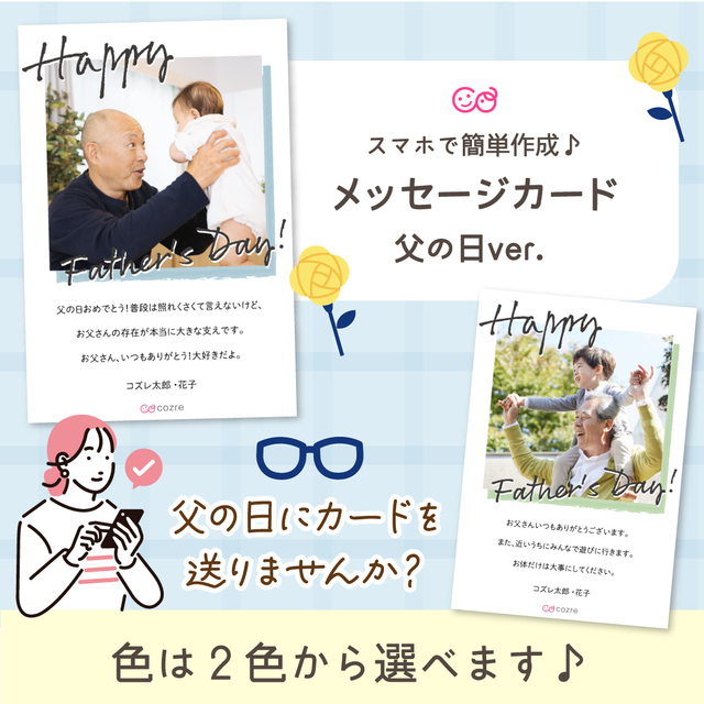 出典:feature.cozre.jpこちらは、パパやお義父さんへ、お子さんの写真と一緒に、感謝の言葉や名前を添えて送れる、父の日限定のメッセージカードが作れます。