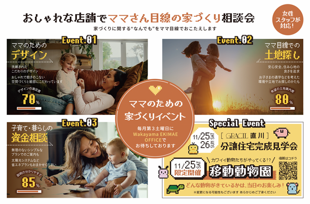 分譲住宅 完成見学会 ■開催期間:11月25日(土)・26日(日)■場所:GRACIL直川毎月第3土曜日 おしゃれな店舗で家づくり相談会も開催中 ・掲載内容や連絡先等は、現在と異なる場合があります。・表示価格は、改正前の消費税率で掲載されている場合があります。ご了承ください。 関連記事 【子供服ファミリーセール】北堀江ヘアサロンEuricaにて12月5日・6日開催 プレスリリース情報 PR 全国各地で開催 ストライダー試乗会イベント FIRST ADVENTURE 開幕 プレスリリース情報 PR ベビーブランド nunaが【第2回オンラインワークショップ】を開催! プレスリリース情報 PR 関連するキーワード