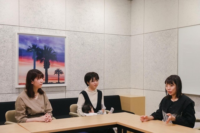 写真上左からさわこさん(妊娠6ヶ月/看護師/就業中)、n.nさん(理学療法士/育休中)と生後6ヶ月のなぎさちゃん、のぞみさん(妊娠7ヶ月/会社員/産休直前)