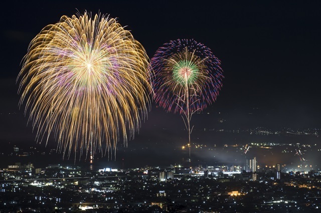 夏なら、蒲郡まつりで人気の花火も見どころ。「正三尺玉」は東京スカイツリーよりも大きな直径約650mもの大きさに花開くのだそう!